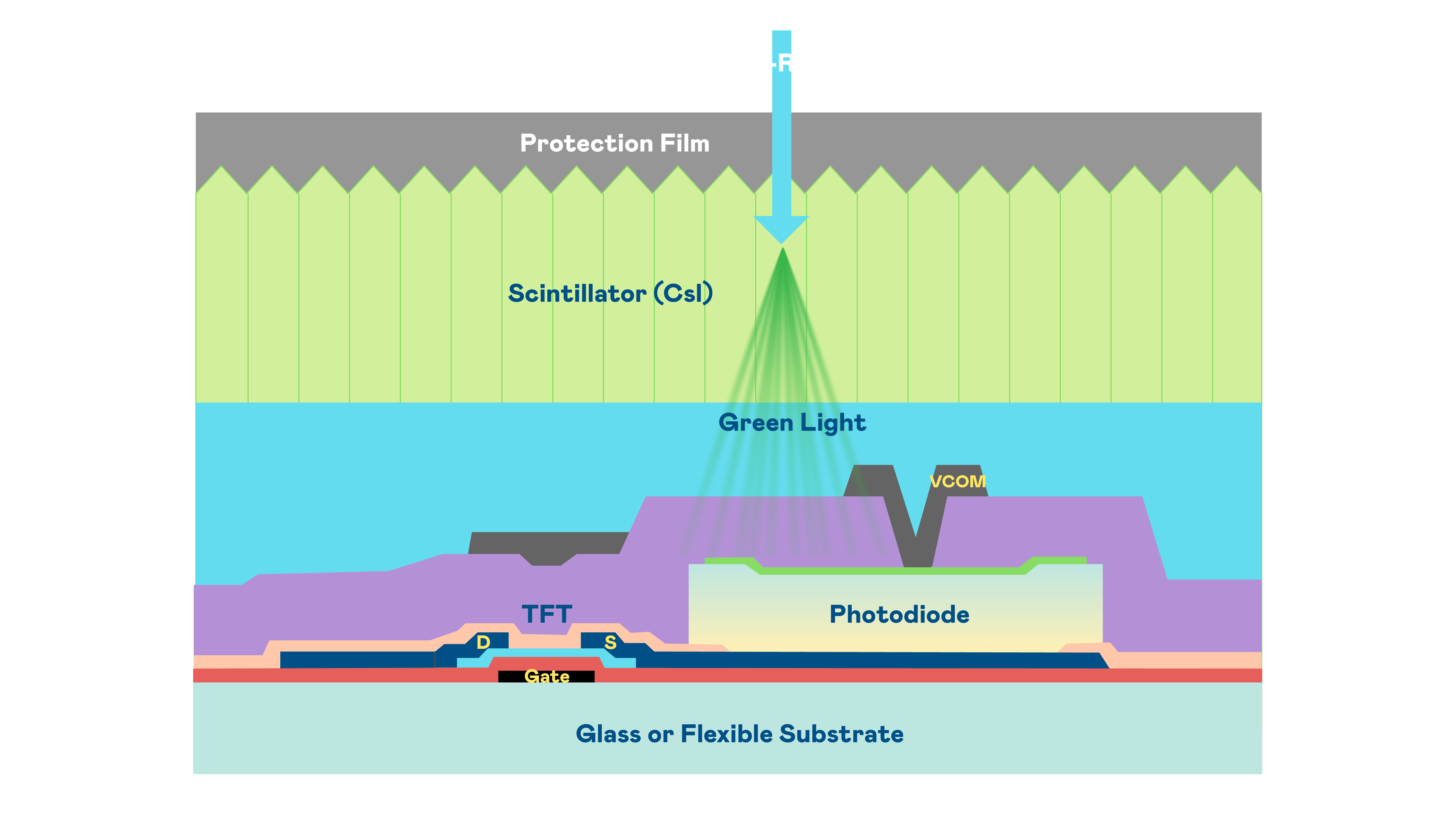 冰球突破的X光影像感測陣列使用薄膜電晶體 (TFT) 作為每個像素的讀取開關,搭配光電二極體(Photodiode)的光電轉換元件,用以感測X光影像訊號。